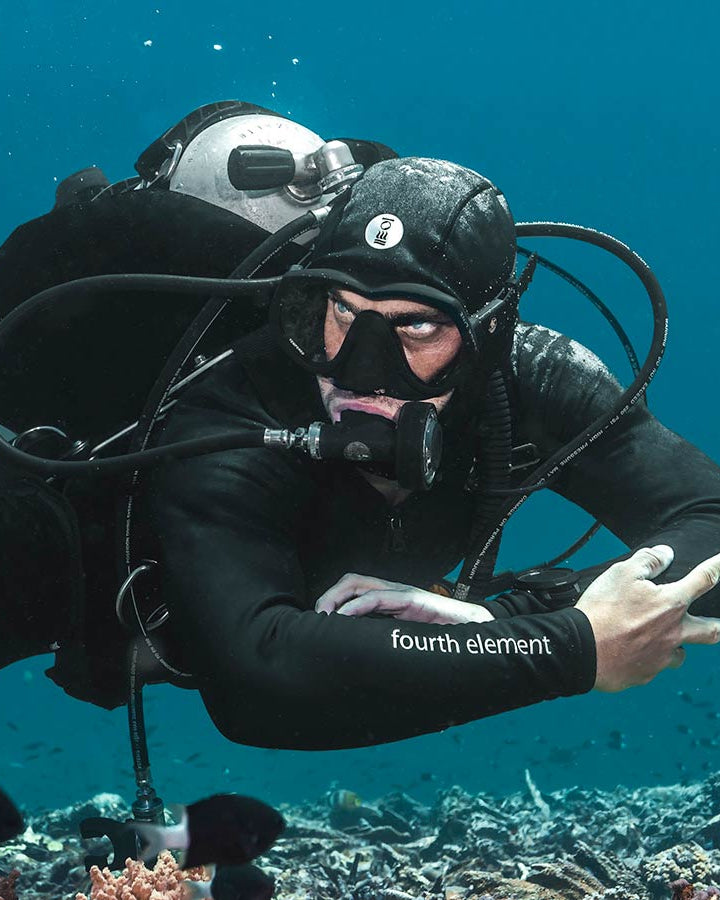 Crafted with 78 % recycled nylon from ghost fishing nets, Thermocline is an OceanPositive innovation combining a waterproof membrane and thermal fleece for exceptional comfort in and out of the water. The inner fleece draws moisture away from the skin while the outer layer blocks wind and traps warmth, making it perfect for both underwater and surface activities.