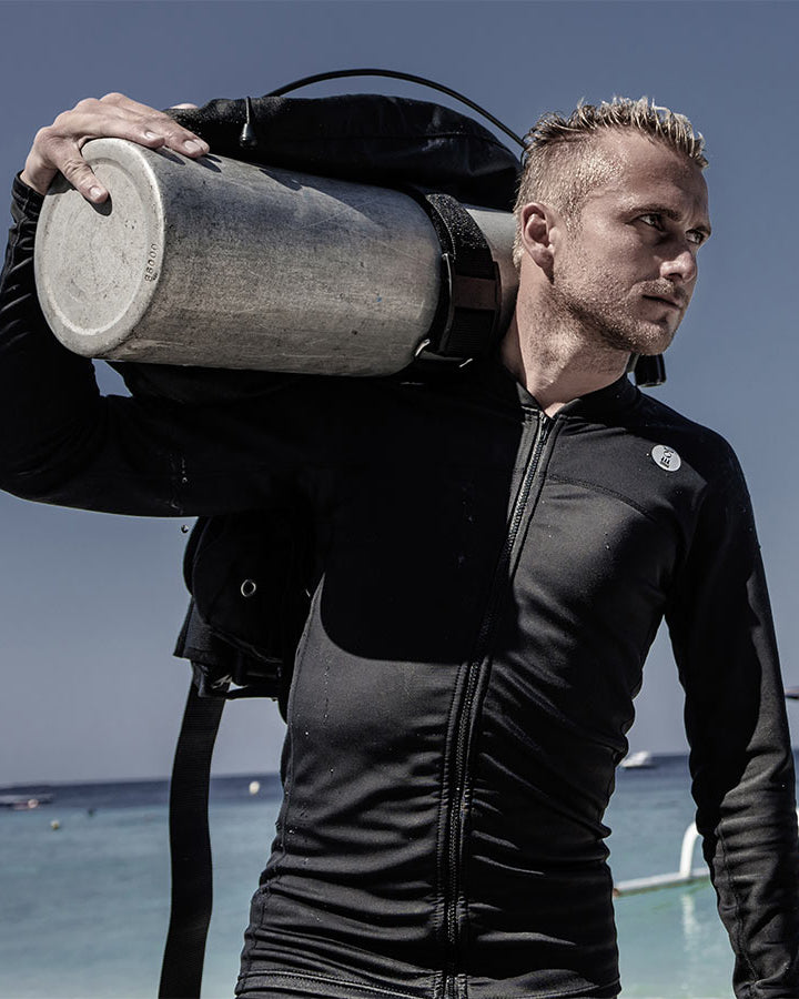 Choose between the one-piece suit or the two-piece system (top + leggings). The modular design allows a personalized fit, which is perfect when the body requires different top and bottom sizes, and makes it effortless to put on or remove between dives. Both options deliver reliable sun and sting protection, breathable comfort, and easy movement.